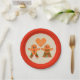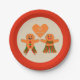 This awesome set of paper party plates features a graphic image of a cute gingerbread couple. The gingerbread man has green and red buttons and green and red fringed trousers. The gingerbread lady has pretty eyelashes and wears red lipstick. She has a green and red fringed skirt and top on. Both have a big smile. There is a gingerbread heart above the couple showing their love for each other. There is white writing inside the heart that says "made for eachother". This would make a lovely gift for a couple at Christmas.