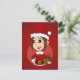A postcard with an illustration of a cute smiling girl with brown hair, the girl is wearing a Santa Claus costume with a red hat and holding a present. On a red background. With a customisable text template for your name or message.