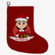 Christmas stocking with an illustration of a cute smiling girl with short black hair, the girl is wearing a Santa Clause costume with a red hat and holding a present; in a red circle on a red background, with an editable text template for your name or message