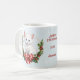 Cute Christmas mug with cute white kitten in Christmas wreath on the snowy light blue background and your own text. Easily customise the text or leave it blank - Kate Eden Art
