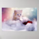 A poster with a photograph of a ginger kitten sitting on a soft white and red Santa hat. Blurry glittering lights bokeh background.