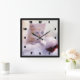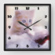 Square clock with a photograph of a ginger kitten sitting on a soft white and red Santa hat. Blurry glittering lights bokeh background.