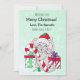 Adorable hand drawn whimsical card with a cute festive mouse wearing a Santa hat holding a candy cane surrounded by gifts. Just add your names in the personalise area.