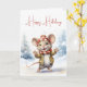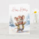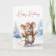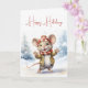 Watercolor Christmas mouse wearing hat and scarf with pine tree in snowflakes.