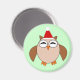 This fun Christmas magnet features a funny cartoon of a Christmas owl with sleepy eyes, a small orange beak and cute little orange feet. The owl is brown with a cream belly and is wearing a red and white Santa hat ready for Christmas.