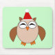 This mousepad features a funny cartoon of a Christmas owl with sleepy eyes, a small orange beak and cute little orange feet. The owl is brown with a cream belly and is wearing a red and white Santa hat ready for Christmas.
