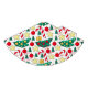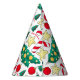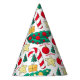 This party hat features a cheerful Christmas pattern filled with cartoon-style trees, stars, red ornaments, candy canes, and gifts. The bright festive colors add a fun holiday vibe to any winter celebration or Christmas gathering.