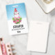 Name badge with a cute and whimisical design featuring an adorable penguin wearing a red santa hat. Standing behind a bouquet of flowers with pink and white striped candy canes. A snowy winter background with snowflakes falling.