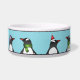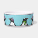 Destei's original illustration of cute and festive Christmas theme Gentoo penguins. One penguin is wearing a green scarf, another one is wearing purple ear protection and the third penguin is wearing a red and white Santa hat. The background colour is light blue with black top and bottom borders. There is also a personalizable text area for a name or other custom text.
