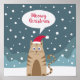 Cartoon santa cat in snowy landscape wishing meowy christmas. Cute funny kitten with santa claus hat saying holidays greetings.