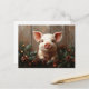 Postcard featuring a digital oil painting of a cute pig surrounded by pine cones and pine tree garland with Christmas lights. The wood background adds a rustic vibe to the artwork.