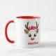 Cute Christmas mugfeatures an image of a red nosed reindeer face. Personalise this festive mug with a name or other custom text. Great festive holiday gift for family and friends.
