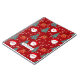 This design features a cute face of Santa Claus and reindeer faces with Christmas trees decorated with ornaments as snow falls, on a burgundy red background. Personalise by editing the text in the text box.