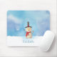 Personalised mousepad with a cute snowman illustration. He is wearing a black stovepipe hat, holding a classic corn cob pipe, and wearing a red scarf. Standing in the cold white snow smiling and waving hello. The background is composed of a watercolor sky with blue and purple colours blending and mingling together.