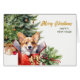On this Holiday card, a cute Corgi dog pops out of a red Christmas gift box. Behind him is a decorated Holiday tree. The gold script text at the right says "MERRY CHRISTMAS", with HAPPY NEW YEAR in green below it. All the text, inside and out, may be easily changed to anything you'd like. You can see more dog images and products at Dog Village.