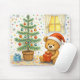 Sweet Christmas mousepad featuring a smiling teddy bear in a Santa hat holding a gift beside a decorated Christmas tree, colorful presents, a glowing window, and festive retro-style confetti stars. Soft red, green, blue, and gold accents give this cozy holiday design a cheerful seasonal look for any desk.