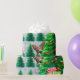 Rows of bare handpainted, watercolor conifers march across a frosty background. In front, a slightly goofy-looking dog peeks around a tree decorated with strings of red baubles to eye some gaily wrapped packages.