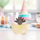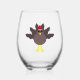 This awesome stemless wine glass features a funny cartoon of a Christmas turkey with big black eyes, a small yellow beak and tail feathers sticking up. The feet are facing in opposite directions making the turkey look clumsy. The turkey is wearing a red and white Santa hat and is ready for Christmas.