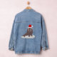This awesome denim jacket features a graphic image of a cute little Christmas Walrus. The Walrus has brown fur with big black eyes and white tusks. It is sitting on an iceberg in the middle of the ocean and wearing a red and white festive hat.