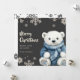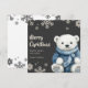The design features a sweet white bear in a blue knitted sweater, set against a grey background with delicate snowflakes.
