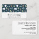 A business card with a whimsical festive pattern. Polar bears, reindeers, trees. foxes, and snowflakes. On a dark green background.