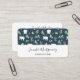 A business card with a whimsical festive pattern. Polar bears, reindeers, trees. foxes, and snowflakes. On a dark green background.