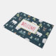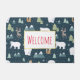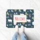 A welcome door mat with a whimsical festive pattern. Polar bears, reindeers, trees. foxes, and snowflakes. On a dark green background.