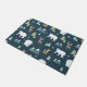 A door mat with a whimsical festive pattern. Polar bears, reindeers, trees. foxes, and snowflakes. On a dark green background.