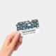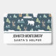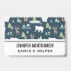 Name badge with a whimsical festive pattern. Polar bears, reindeers, trees. foxes, and snowflakes. On a dark green background.