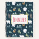 Spiral notebook with a whimsical festive pattern. Polar bears, reindeers, trees. foxes, and snowflakes. On a dark green background.