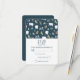 An RSVP card with a whimsical festive pattern. Polar bears, reindeers, trees. foxes, and snowflakes. On a dark green background.