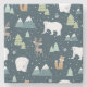 Stone coaster with a whimsical festive pattern. Polar bears, reindeers, trees. foxes, and snowflakes. On a dark green background.