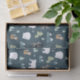 Tissue paper with a whimsical festive pattern. Polar bears, reindeers, trees. foxes, and snowflakes. On a dark green background.
