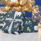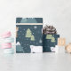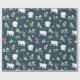 Wrapping paper with a whimsical festive pattern. Polar bears, reindeers, trees. foxes, and snowflakes. On a dark green background.