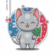 A cheerful cat holding a small Christmas tree. Snowflakes and stars hang around, creating a playful holiday scene perfect for cards.
