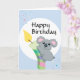 A child-friendly cute chubby cartoon Koala clutching a candle illustration birthday greeting card, with flying confetti in the background. Can be used on 1st birthday.