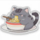 Adorable chubby cat happily eating a bowl of ramen. Perfect for cat lovers and noodle fans!