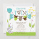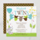 Start your twins baby shower off right with our sweet baby bodysuit clotheslines baby shower invitation for a boys twin birth combination. Our multiple baby shower invitation for boy twins features a cute bunny sitting on a lawn with a blue & yellow flowers with two clotheslines with blue, lime green & brown baby bodysuits. Coordinating brown & lime green polka dots back. Visit our shop for matching thank you note cards, stickers and postage stamps Baby bodysuits are © Erin Bradley Designs