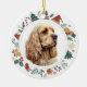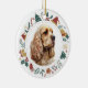 Here's a cute personalised ornament for anyone who loves a Cocker Spaniel dog. The front has a beautiful watercolor image of a buff coloured American Cocker Spaniel. The dog portrait is framed within a colourful circle wreath made up of various Holiday images, including a snowman, bells, candy cane, stocking, holly, and more! The back of the ornament has the same wreath image with a Christmas and New Year's greeting. Be sure to update the custom text field for the appropriate name and year. And see more spaniel dog images and products at Dog Village.
