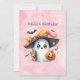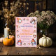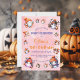 The invitation background is a blend of soft purples and orange. Below that, there’s space to fill in all the party details, like the date, time, and location, surrounded by cute little coffee mugs and friendly ghost illustrations. This invite is the perfect mix of spooky fun and cosy cuteness, setting the tone for a birthday party full of smiles, laughter, and playful ghostly charm!