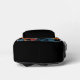 Under the mesh pocket on the right lower side, where you can keep a water bottle or something, there is a text field you can change to whatever text you want.