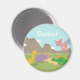A cute and colourful dinosaur magnet which kids can use to attach their dinosaur drawings to the fridge. It comes with cartoon dinosaurs, a yellow Brachiosaurus, a purple Triceratops, a green Stegosaurus and a pink Pterodactylus. Background of mountains and clouds. This attractive design is great for kids who love Jurassic, prehistoric or dinosaur themes. Personalise with child's name to make it extra special!