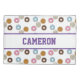 This cute and stylish pillow case features a tiled pattern of illustrated colourful doughnuts. Five separate doughnuts are printed with pink, white, orange, baby blue, and brown chocolate frostings. The yummy looking frosted doughnuts have different sprinkles on each. A sample name is printed across the centre which you can personalise to include your own name or custom text.