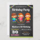 Amaze your guests with this colourful birthday party invite featuring adorable little kids playing with skipping rope with modern typography on a chalkboard background. Simply add your event details on this easy-to-use template to make it a one-of-a-kind invitation. Flip the card over to reveal a colourful stripes pattern on the back of the card.