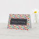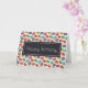 Happy Birthday greeting card with a personalised message inside. Designed with a cute pattern of macarons in many different colours with a faint polka dot pattern behind. A black rectangle layered over top with Happy Birthday written inside.