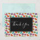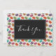 A flat thank you card with a cute pattern of macarons in many different colours with a faint polka dot pattern behind. A black rectangle layered over top with the word: Thank You" written inside. Personalise with your own message on the back.