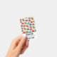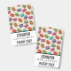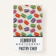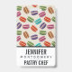 Name badge with a cute pattern of macarons in many different colours with a faint polka dot pattern behind.