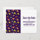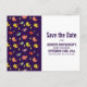 Save the date postcard with a pattern of hand-drawn whimsical birds. Cute little green pine trees between them. Set on a purple background.