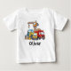 This playful, personalised kids' t-shirt features a construction crew that includes a happy red dump truck, a smiling yellow excavator, a friendly blue bulldozer, and a cheerful orange crane.