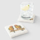 The coasters are gorgeous, a quality feel and heavy weight. They look like a precious archeological find. A rustic stone juxtaposed with a modern floral black and white print. I like the way the print goes slightly imperfect on the cut stone edges giving them a kind-of natural beauty.